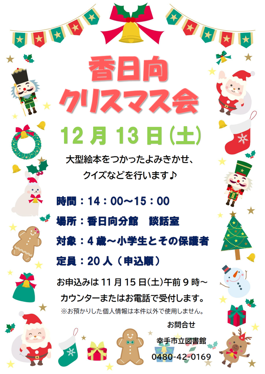 香日向クリスマス会 (更新日:2025年10月12日) 開催日 12月13日(土曜日) 時間 午後2時から午後3時まで 会場 香日向分館談話室 内容 香日向クリスマス会 大型絵本をつかったよみきかせ、クイズなどを行います♪ 申込11月15日(土曜日)午前9時から カウンターまたはお電話にて受付 定員20人 申込順 対象4歳から小学生とその保護者 参加費無料 ちらしはこちらをご覧ください 主催 図書館 PDF・Word・Excelなどのファイルを閲覧するには、ソフトウェアが必要な場合があります。詳細は「ファイルの閲覧方法」を確認してください。 ファイルの閲覧方法