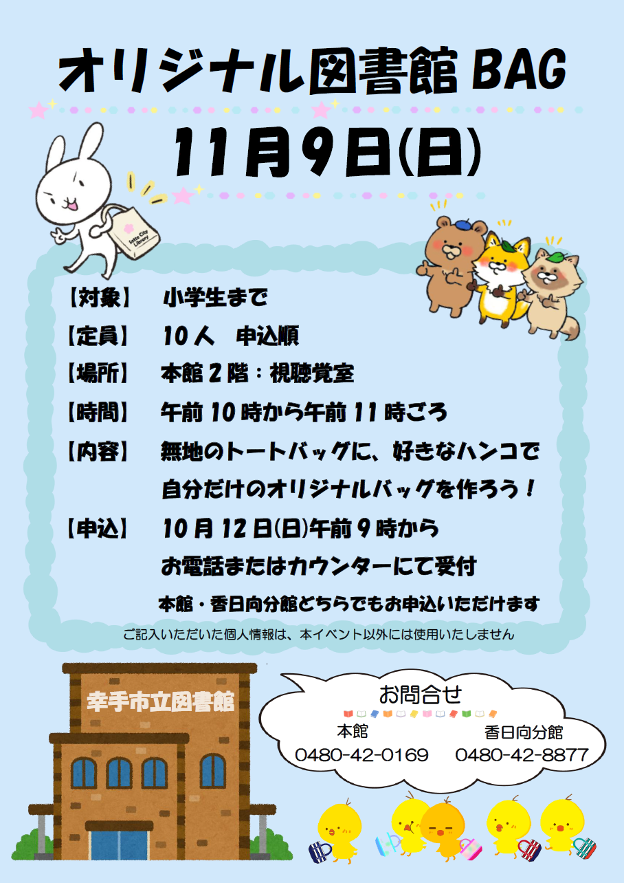 オリジナル図書館BAG (更新日:2025年9月29日) 開催日 11月9日(日曜日) 時間 午前10時から午前11時 会場 図書館本館 2階 視聴覚室 内容 自分だけのオリジナル図書館BAGを作ろう! 申込10月12日(日曜日)午前9時からカウンターまたはお電話で受付 対象小学生まで 定員10名(申込順) 参加費無料 注意:スタンプ用インクを使用しますので、汚れが目立ちにくい服装でご参加ください お問合せ幸手市立図書館 0480-42-0169ちらしはこちらをご覧ください 主催 図書館 PDF・Word・Excelなどのファイルを閲覧するには、ソフトウェアが必要な場合があります。詳細は「ファイルの閲覧方法」を確認してください。 ファイルの閲覧方法