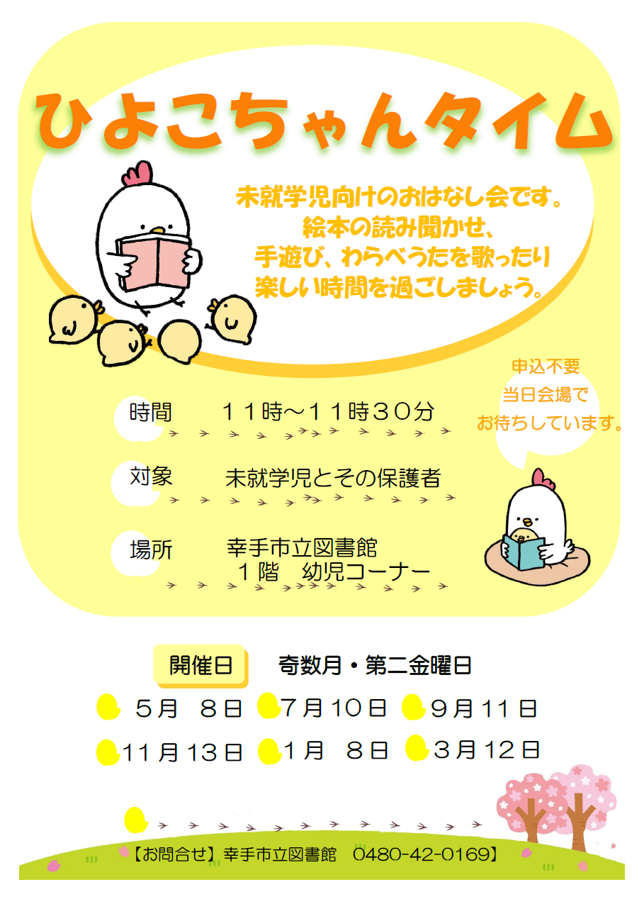 ひよこちゃんタイム (更新日:2026年2月28日) 図書館のお姉さんやお兄さんとあそぼう 開催日 奇数月第2金曜日 時間 午前11時から午前11時30分 会場 本館・1階幼児コーナー 内容 図書館スタッフによる、未就学児向けのおはなし会です。絵本の読み聞かせや手遊びをします。 主催 図書館 R8年度より、会場が本館・1階幼児コーナーに変更になります PDF・Word・Excelなどのファイルを閲覧するには、ソフトウェアが必要な場合があります。詳細は「ファイルの閲覧方法」を確認してください。 ファイルの閲覧方法